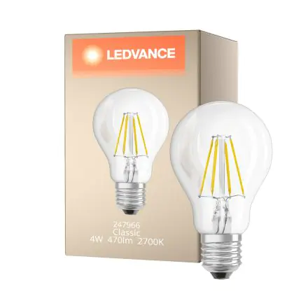 Die Ledvance Classic LED E27 Birne Fadenlampe Klar 4W 470lm - 827 Extra Warmweiß | Ersatz für 40W ist eine effiziente E27 LED-Lampe mit Retrodesign und der perfekte Ersatz für Ihre konventionellen 40W Lampen mit E27. Zudem strahlt sie Licht in der Farbtemperatur 2700K - Extra Warmweiß aus und punktet durch eine lange Lebensdauer.