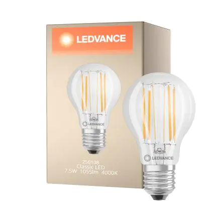 Die Ledvance Classic LED E27 Birne Fadenlampe Klar 7.5W 1055lm - 840 Kaltweiß | Ersatz Für 75W ist eine effiziente E27 LED-Lampe mit Retrodesign und der perfekte Ersatz für Ihre konventionellen 75W Lampen mit E27. Zudem strahlt sie Licht in der Farbtemperatur 4000K - Kaltweiß aus und punktet durch eine lange Lebensdauer.