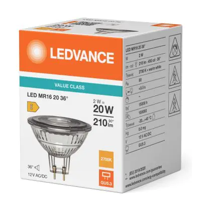Die Ledvance LED MR16 P LED Reflektor GU5.3 PAR16 2W 210lm 36d - 830 Warmweiß| Ersatz Für 20w ist eine effiziente GU5.3 LED-Lampe und der perfekte Ersatz für Ihre konventionelle Halogenlampe mit 20W und einem GU5.3-Sockel, bei dem die beiden Stifte einen Abstand von 5,3 mm zueinander haben. Die Abkürzung MR16 zeigt Ihnen, dass der Reflektor einen Durchmesser von 5 cm hat. Zudem strahlt das Produkt Licht in der Farbtemperatur aus und punktet durch eine lange Lebensdauer.