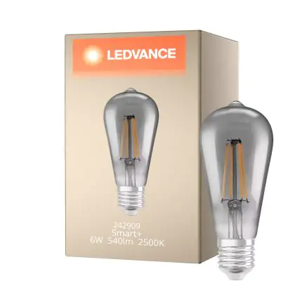 Die Ledvance Smart+ Wifi E27 Edison Classic Fadenlampe Smoke 6W 540lm - 825 Extra Warmweiß | Dimmbar - Ersatz für 50W ist eine effiziente E27 LED-Lampe mit Retrodesign und der perfekte Ersatz für Ihre konventionellen 44W Lampen mit E27. Zudem strahlt sie Licht in der Farbtemperatur 2500K - Extra Warmweiß aus und punktet durch eine lange Lebensdauer.