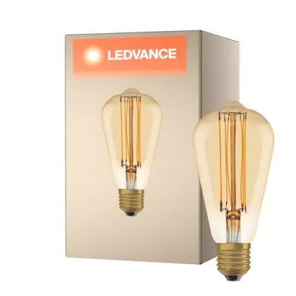 Die Ledvance Vintage 1906 LED E27 Birne Gold 8.8W 806lm - 822 Extra Warmweiß | Dimmbar - Ersatz für 60W ist eine effiziente E27 LED-Lampe mit Retrodesign und der perfekte Ersatz für Ihre konventionellen 60W Lampen mit E27. Zudem strahlt sie Licht in der Farbtemperatur 2200K - Extra Warmweiß aus und punktet durch eine lange Lebensdauer.