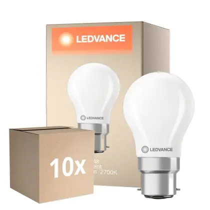 Die Mehrfachpackung 10x Ledvance Classic LED B22 Birne Matt 3.4W 470lm - 827 Extra Warmweiß | Dimmbar - Ersatz Für 40W ist eine effiziente B22 (Bajonettsockel) LED-Lampe mit Retrodesign und der perfekte Ersatz für Ihre konventionellen 40W Lampen mit B22 (Bajonettsockel). Zudem strahlt sie Licht in der Farbtemperatur aus und punktet durch eine lange Lebensdauer.