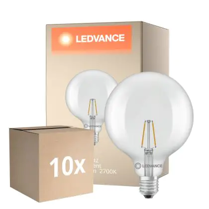 Die Mehrfachpackung 10x Ledvance Classic LED Globe LED E27 Globe Fadenlampe Klar 1.8W 250lm - 827 Extra Warmweiß | Ersatz Für 25W ist eine effiziente E27 LED-Lampe mit Retrodesign und der perfekte Ersatz für Ihre konventionellen 25W Lampen mit E27. Zudem strahlt sie Licht in der Farbtemperatur aus und punktet durch eine lange Lebensdauer.