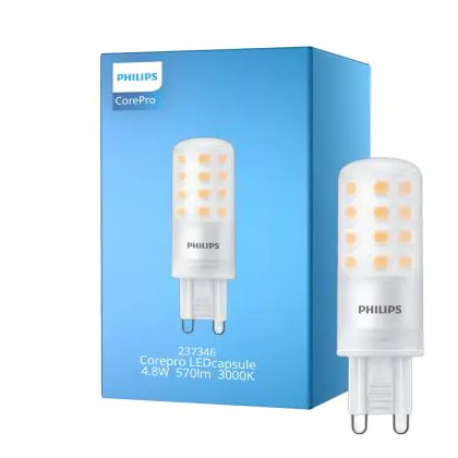Die Mehrfachpackung 10x Philips Corepro LED Kapsel G9 4.8W 570lm - 830 Warmweiß | Ersatz Für 60W ist eine effiziente G9 LED-Lampe und der perfekte Ersatz für Ihre konventionelle Halogenlampe mit 60W und einem G9-Sockel. Die Stifte haben einen Abstand von 9 mm. Zudem strahlt das Produkt Licht in der Farbtemperatur aus und punktet durch eine lange Lebensdauer.