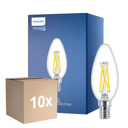 Die Mehrfachpackung 10x Philips MASTER LED E14 Kerze Fadenlampe Klar 2.5W 340lm - 922-927 Dim To Warm | Höchste Farbwiedergabe - Dimmbar - Ersatz Für 25W ist eine effiziente E14 LED-Lampe mit Retrodesign und der perfekte Ersatz für Ihre konventionellen 25W Lampen mit E14. Zudem strahlt sie Licht in der Farbtemperatur 2200K - 2700K Dim To Warm aus und punktet durch eine lange Lebensdauer.