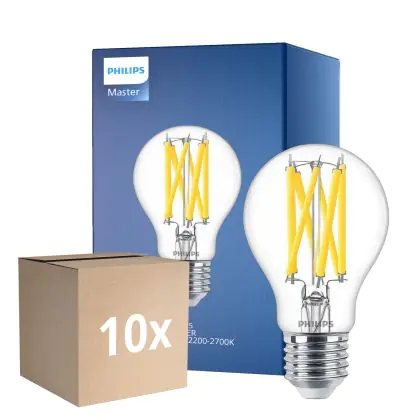 Die Mehrfachpackung 10x Philips Master LED E27 Birne Fadenlampe Klar 10.5W 1521lm - 922-927 Dim To Warm | Höchste Farbwiedergabe - Dimmbar - Ersatz Für 100W ist eine effiziente E27 LED-Lampe mit Retrodesign und der perfekte Ersatz für Ihre konventionellen 100W Lampen mit E27. Zudem strahlt sie Licht in der Farbtemperatur aus und punktet durch eine lange Lebensdauer.
