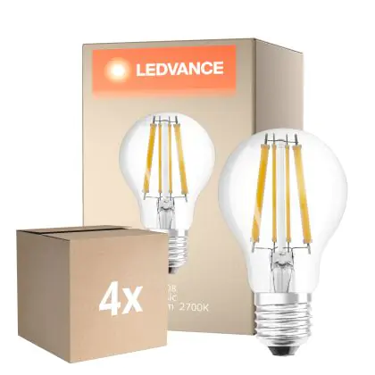 Die Mehrfachpackung 4x Ledvance Classic LED E27 Birne Fadenlampe Klar 11W 1521lm - 827 Extra Warmweiß | Dimmbar - Ersatz Für 100W ist eine effiziente E27 LED-Lampe mit Retrodesign und der perfekte Ersatz für Ihre konventionellen 100W Lampen mit E27. Zudem strahlt sie Licht in der Farbtemperatur 2700K - Extra Warmweiß aus und punktet durch eine lange Lebensdauer.