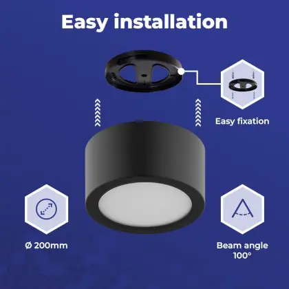 Die Noxion LED Downlight Hera Oberflächenhalterung Schwarz 21W 2400lm - 827-830-840 CCT | 200mm ist eine Feuchtraumleuchte. Sie strahlt Licht in der Farbtemperatur 2700K - 3000K - 4000K CCT aus und punktet durch eine lange Lebensdauer. Diese Leuchte ist speziell zur Verwendung in Feuchträumen (Keller, Waschräume, etc.) vorgesehen.
