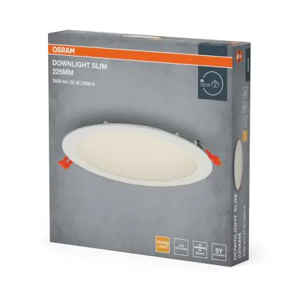 Bei dem Produkt “Osram LED-Downlight Recess Slim Weiß 22W 2000lm 110D - 830 Warmweiß | Ausschnitt 200mm - IP20” handelt es sich um einen effizienten LED-Deckenspot, welcher Licht in der Farbtemperatur ausstrahlt und durch eine lange Lebensdauer punktet. Das Downlight ist recycelbar und umweltfreundlich, denn es enthält kein Quecksilber.