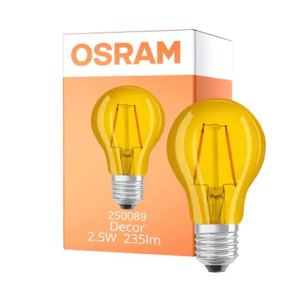 Die Osram LED Star Classic Decor E27 Birne Fadenlampe Matt 2.5W 235lm - Gelb | Ersatz Für 23W ist eine effiziente E27 LED-Lampe mit Retrodesign und der perfekte Ersatz für Ihre konventionellen W Lampen mit E27. Zudem strahlt sie Licht in der Farbtemperatur Gelb aus und punktet durch eine lange Lebensdauer.