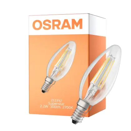 Die Osram LED Superstar Classic E14 Kerze Fadenlampe Klar 2.2W 300lm - 927 Extra Warmweiß | Dimmbar - Ersatz Für 25W ist eine effiziente E14 LED-Lampe und der perfekte Ersatz für Ihre konventionellen 25W Lampen mit E14-Sockel. Zudem strahlt sie Licht in der Farbtemperatur 2700K - Extra Warmweiß aus und punktet durch eine lange Lebensdauer.