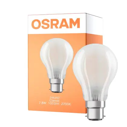 Die Osram Retrofit Classic LED B22d Birne Matt 8.5W 806lm - 827 Extra Warmweiß | Dimmbar - Ersatz für 60W ist eine effiziente B22 LED-Lampe und der perfekte Ersatz für Ihre konventionelle Halogenlampe mit 75W und einem B22-Sockel (Bajonettsockel). Zudem strahlt das Produkt Licht in der Farbtemperatur 2700K - Extra Warmweiß aus und punktet durch eine lange Lebensdauer.