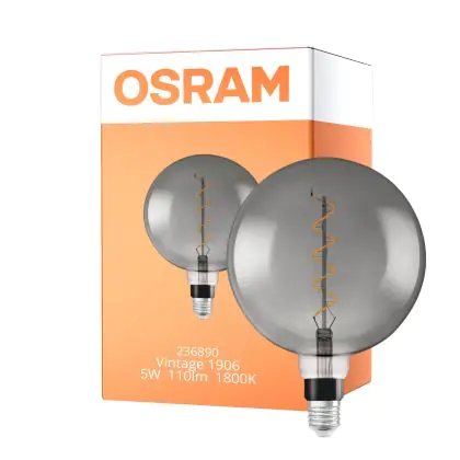 Die Osram Vintage 1906 LED E27 Globe Fadenlampe Smoke 200mm 5W 110lm - 818 Extra Warmweiß | Dimmbar - Ersatz für 25W ist eine effiziente E27 LED-Lampe mit Retrodesign und der perfekte Ersatz für Ihre konventionellen 25W Lampen mit E27. Zudem strahlt sie Licht in der Farbtemperatur 1800K - Extra Warmweiß aus und punktet durch eine lange Lebensdauer.